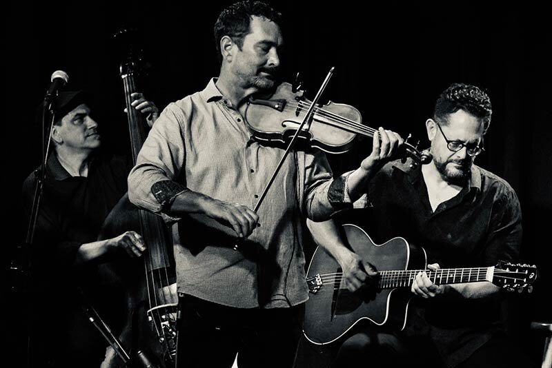 Keven Aland on vocals/violin, Jon McLaughlin on guitar and Glenn Stevenson on double bass play gypsy jazz and world music.
